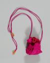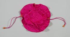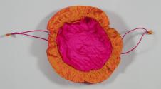 Physical DescriptionPhysical DescriptionCircular drawstring pouch made of an pink and iridescent orange material. There are drawstrings on either side of the bag that can be pulled tight to close the bag.