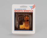 Physical DescriptionTwo silver-toned brass sports whistles that come with a black whistle cover and a white lanyard with metal clip. The whistles are still in plastic and paper packaging.