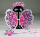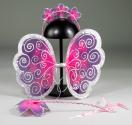 Physical DescriptionTwo three-piece sets of pink and purple glittery fairy wings (.a), wand (.b), and headband (.c). The wings have pink heart details and silver glitter swirls. Wrapped around the handle of the wand and the band of the head band is pink ribbon and silver-toned beads. The point of the wand is a flower with silver glitter and there are three matching flowers across the top of the headband. The fabric across all pieces have a pink to purple ombre.