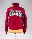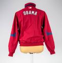 Physical DescriptionTwo red and navy blue women's long sleeve zip-up jacket with the 2009 World Series logo in the center. Logo is in white, navy blue, and gold, with a light blue trim. Navy blue parts on jacket are side panels and cutouts on sleeves. Embroidered in white on the reverse is "Obama." At the nape of the neck there is a rubber MLB logo.