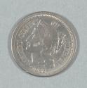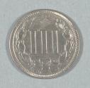Physical DescriptionPhysical DescriptionAn 1865 American 3 cent nickel coin minted in Philadelphia. On the front is the Liberty head facing left. She is wearing a headpiece that ties in the back and has shoulder length hair. On the back are Roman numerals III in the center surrounded by a vegetative wreath. Both sides are ringed with a corded rope motif along the rim.