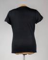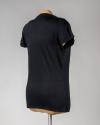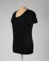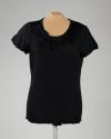 Physical DescriptionSolid black short sleeve blouse with four chiffon flowers along the right side of the collar and puff sleeves.