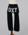 Physical DescriptionBlack sweatpants branded for Occidental College with "OXY" printed in white across the reverse. The pants have a drawstring waist and elastic around the ankles.