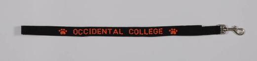 Physical DescriptionBlack pet leash with embroidered orange detailing spelling out "Occidental College" three times down the length. The words are framed with embroidered paw prints. One end of the leash has a loop and the other has a silver-toned metal clip.