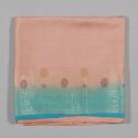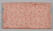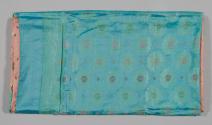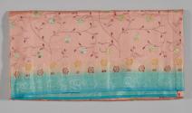 Physical DescriptionSalmon pink and teal two-piece sari ensemble composed of one long cloth (.a) and one short cloth (.b). Both pieces have a floral embroidered trim in cream, yellow, and red. On the shorter cloth the teal is only along the short finished edges. The larger cloth has teal trim along all edges and an aditional pink and gold embroidered floral pattern throughout the first section of the pink center.