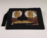 Physical DescriptionPhysical DescriptionBlack canvas purse with gold, black and brown beads and sequins in the design of a abstract face on the front. The interior is split into two pockets and closed with a zipper attached with a large black tassel.