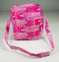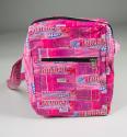 Physical DescriptionPink bag made from the recycled wrappers from "FanYogo" strawberry yogurt. Bag has a zipper pocket on the front and a zipper closure, with a single shoulder strap.