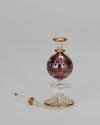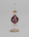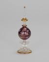 Physical DescriptionPhysical DescriptionGlass perfume bottle (.a) with a purple sphere at its center to hold the perfume. The sphere has white and gold flower and leaf designs throughout. Below the sphere are two platforms with vertically pinched edges around their circumference. There is gold detailing throughout the bottle. Resting in the bottle is a glass spire-shaped applicator (.b) with gold detailing at the top and middle.