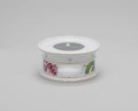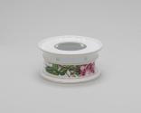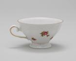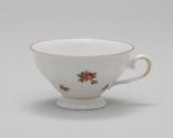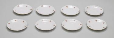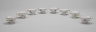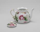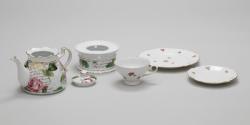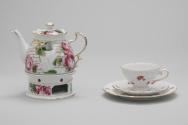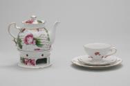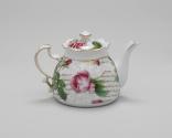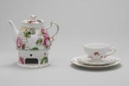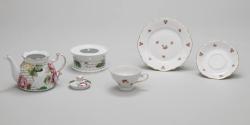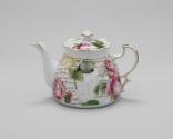 Physical DescriptionPink rose tea set that consists of a teapot (.a) with lid (.b), eight dessert plates (.c-.j), eight tea cups(.k-.r), eight saucers (.s-.z), and a teapot warmer (.aa) . The teapot warmer, teapot, and lid are decorated with pink roses with green leaves. Behind the roses are writing and lines that are meant to give the decoration an aged look. The cups, saucers, and dessert plates are all decorated with small red roses with green leaves. Each piece has metal around the rim.